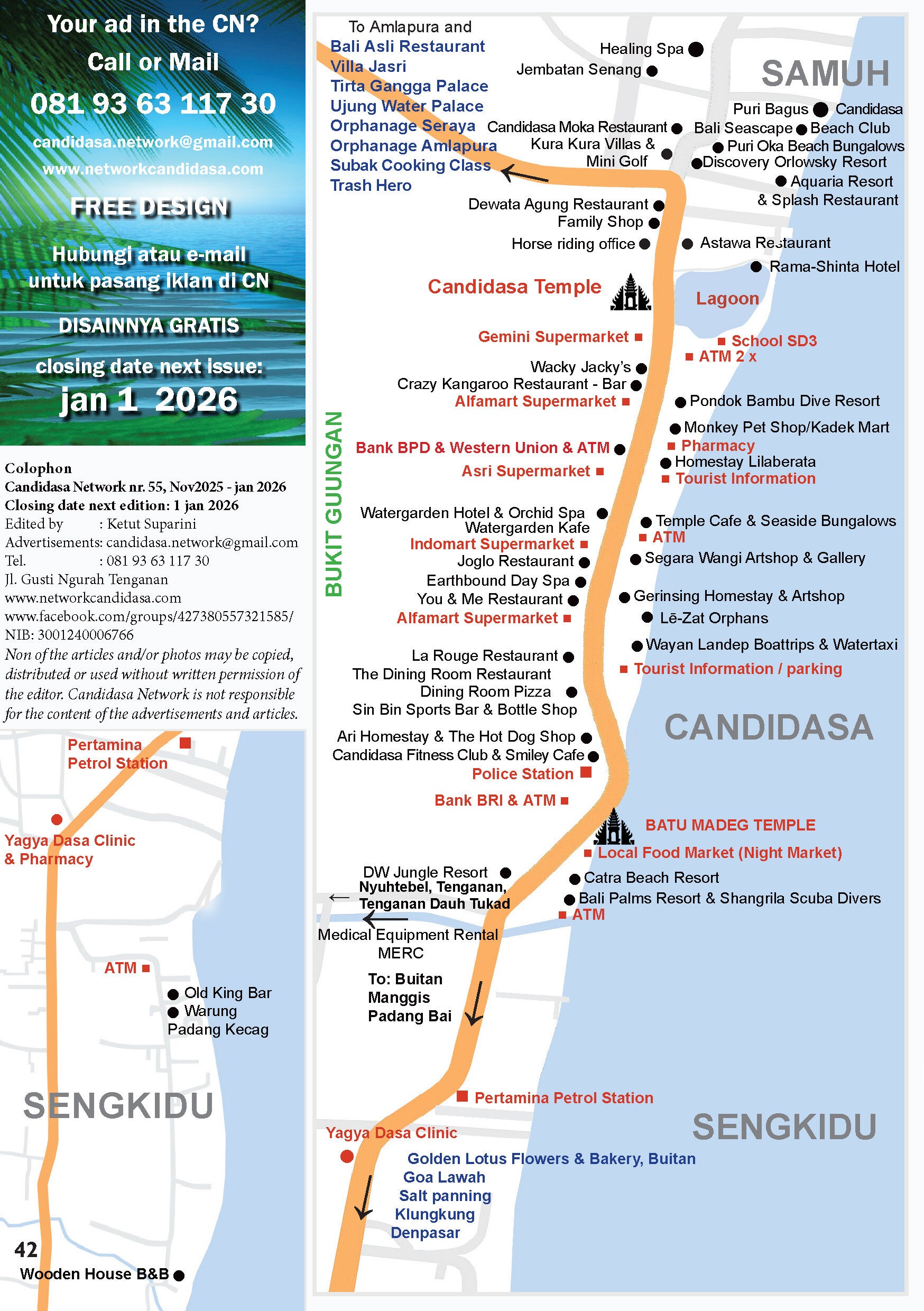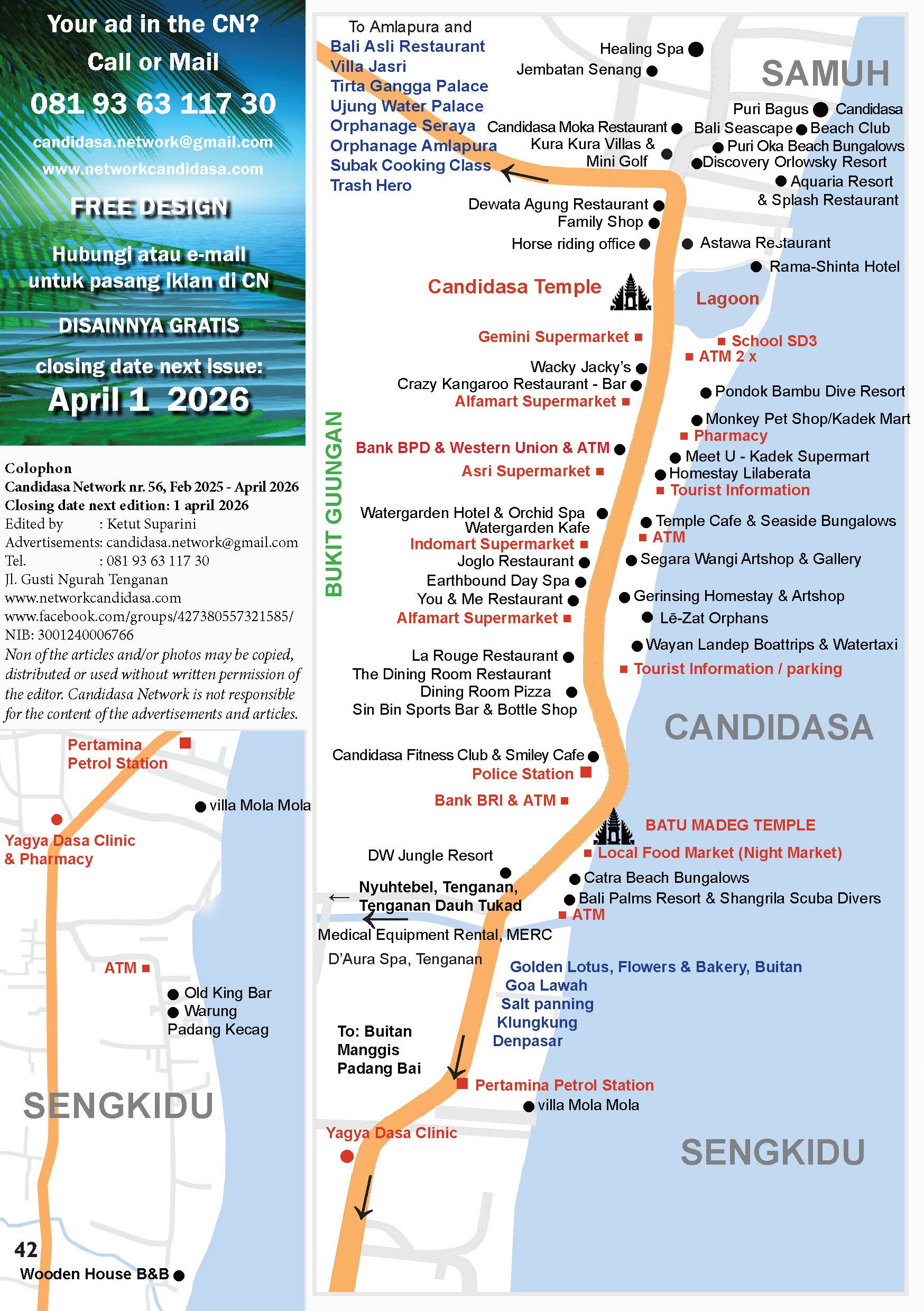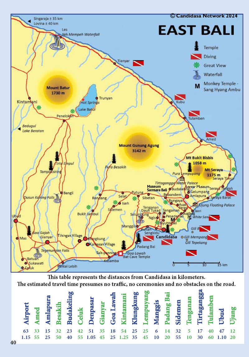 - maps of East-Bali and Candidasa area (p. 40 & 42)