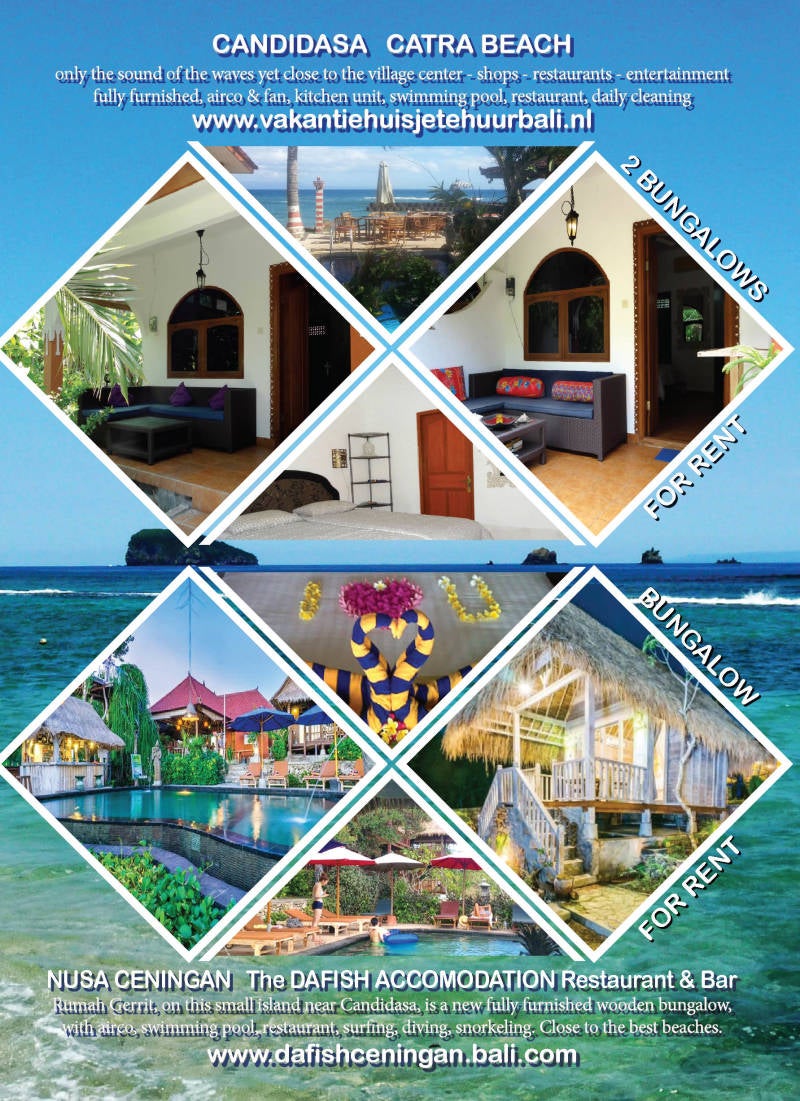 Renting a house gives optimal freedom to do whatever comes up and to eat whenever the stomach calls. All houses below have daily cleaning, laundry facilities, swimmingpool and cooking facilities. Catra Beach has its own restaurant, the others have restaurants just around the corner. Tours, diving or trekking can be arranged. The bungalows and villa's can be rented for short or long term.