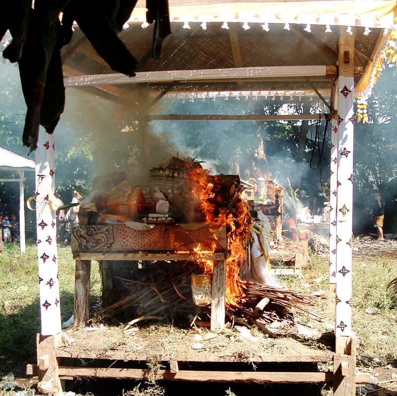 The coffin is taken out of its decorative casing and placed in a white or black bull, a red or black lion or in a simple wooden construction or on a table. With kerosin the pyre is set on fire. On a separate pyre all items used by the diseased in the last period of his/her life as well as the items used in the ceremony will be burned . The ash of the body is brought to the sea. After a last ceremony the ash together with the offerings will start the journey to eternity.