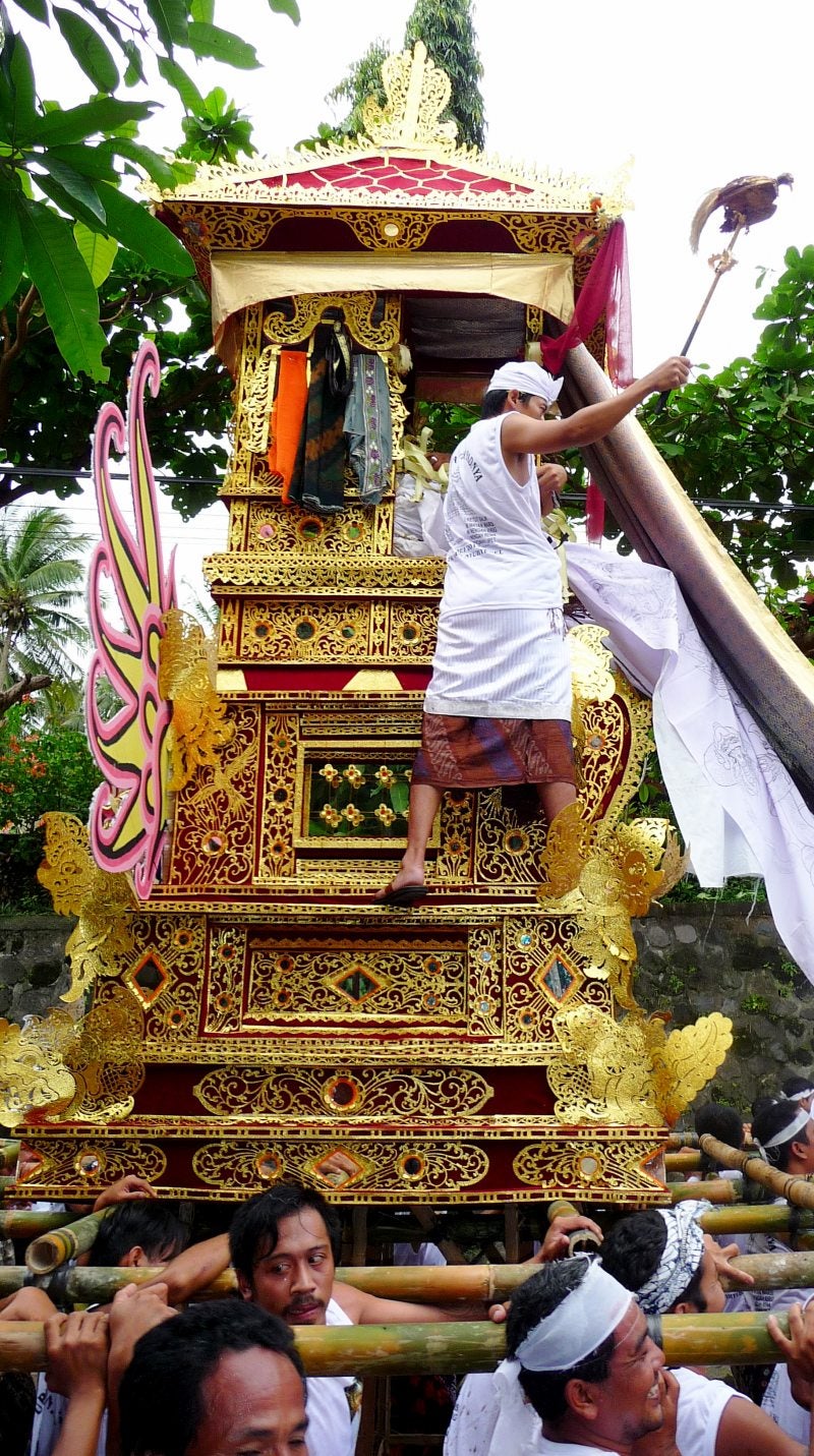 On the way to the cremation field the coffin construction will be turned, twisted and shaken to confuse the spirit of the diseased so it will not return to the family house to haunt the inhabitants. Also evil spirits are supposed to get mixed up by all the movements and antics of the group carrying the coffin, to prevent them to influence the family and the spirit of the diseased. Family and friends follow the procession by foot, accompanied by a gamelan orchestra to help the spirit to find its way to heaven.